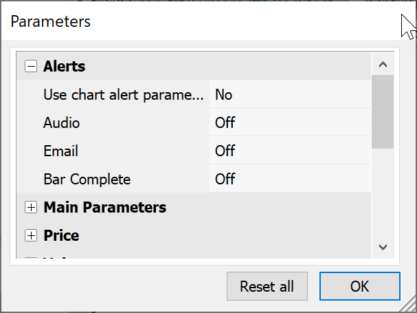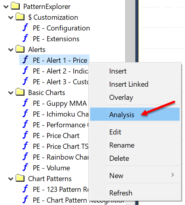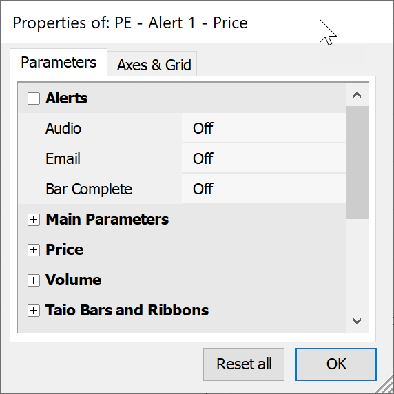 Almost all PatternExplorer tools have alerts implemented, and they consist of three chart parameters as shown below. In the automatic analysis parameters, there is a fourth parameter, called “Use chart alert parameters” which allows syncing the chart settings with automatic analysis. The default parameter value is No but can be changed to Yes in the PE – Configuration.afl file.
