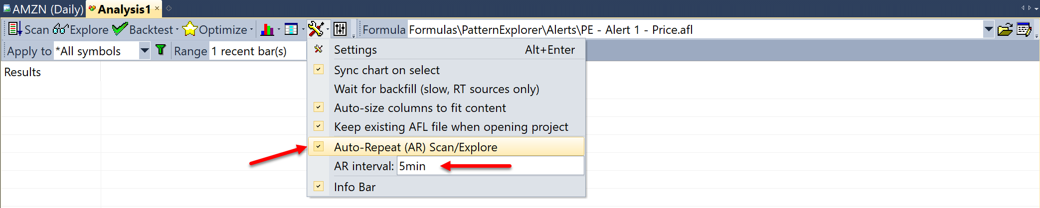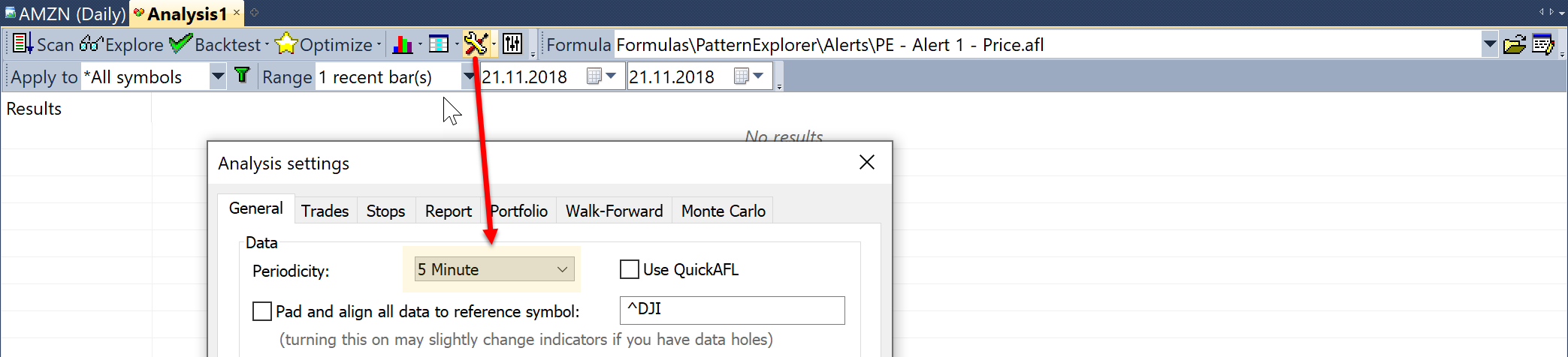 To receive alerts for all markets, you have to open your desired alert tool in the automatic analysis window and scan all markets. You can also do this automatically in your preferred interval. The images below illustrate the settings, but more detailed instructions are available in the AmiBroker help, which is highly recommended to read.