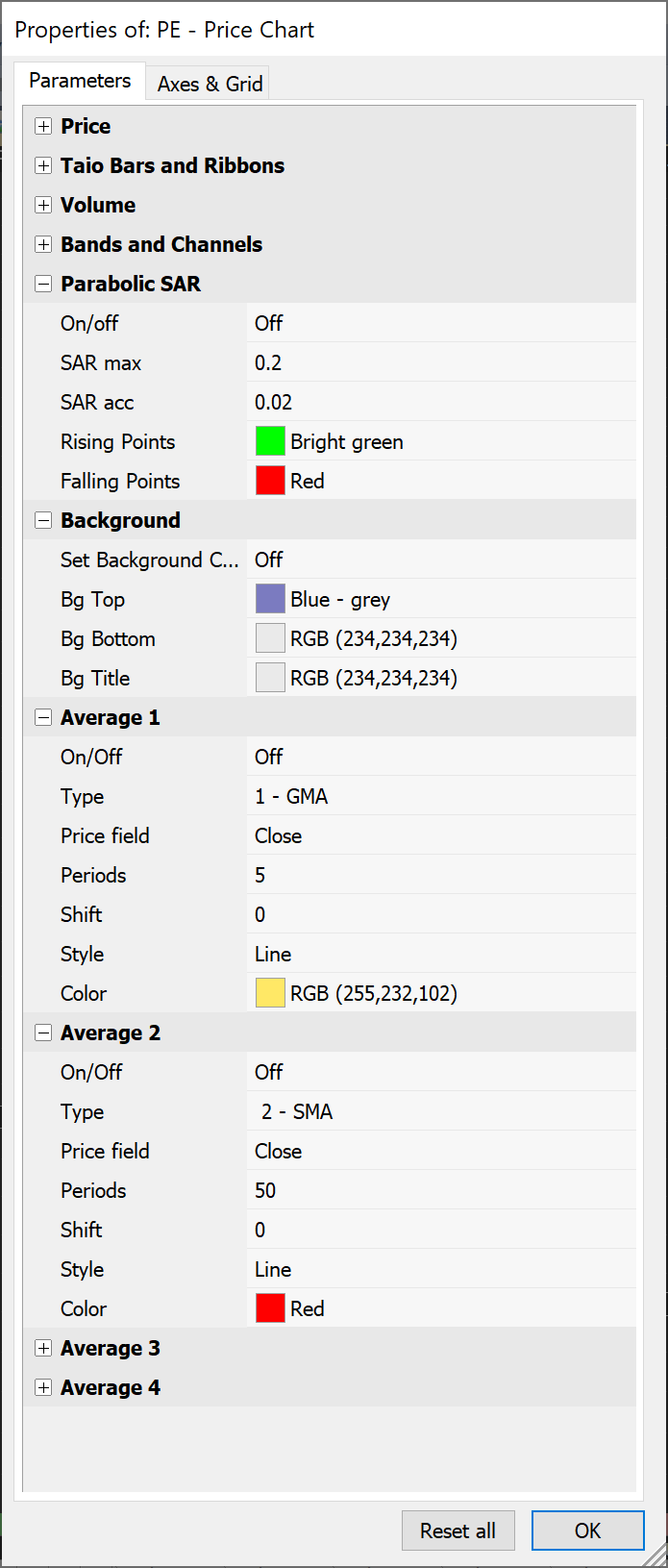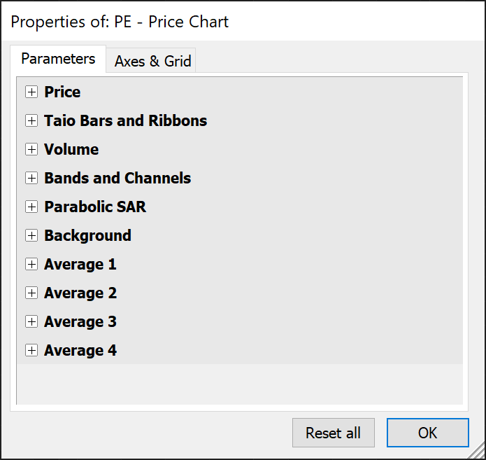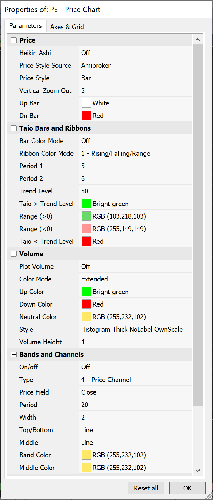 Note that when inserting indicators the very first-time AmiBroker doesn’t display the parameter sections. Just close the parameter window and open it again. After adding an indicator, the parameter window opens with all parameters as usual. Also, AmiBroker doesn’t recognize indicator updates through software installation which results in random parameter alignment. Just click the Reset all button to bring them back as designed.