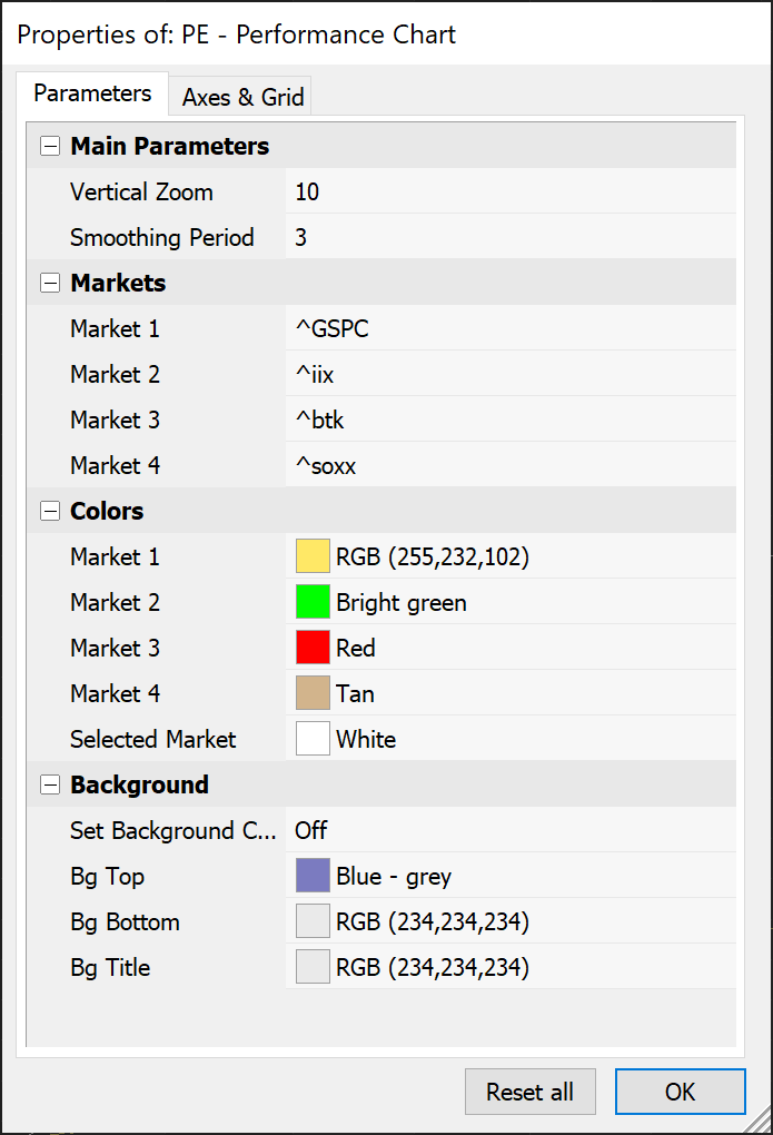 The indicator uses the default symbols of the Yahoo data feed. They can be changed through the parameter window and also through the code in the customization file PE – Customization.afl