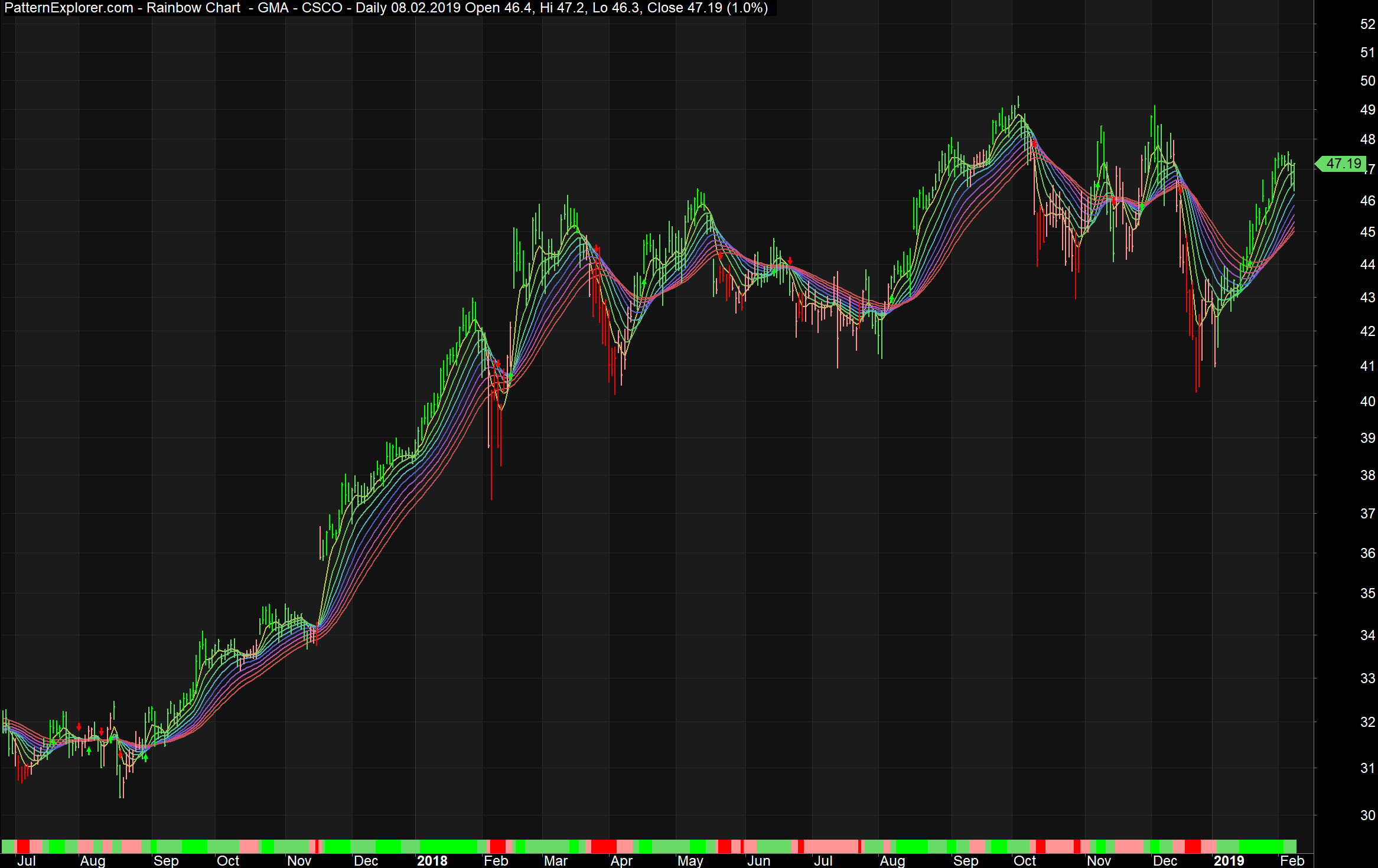 The rainbow chart plots multiple averages together. You can define the amount and types of moving averages through the parameters. Up to 10 different averages are available. Default buy & sell conditions are listed below.