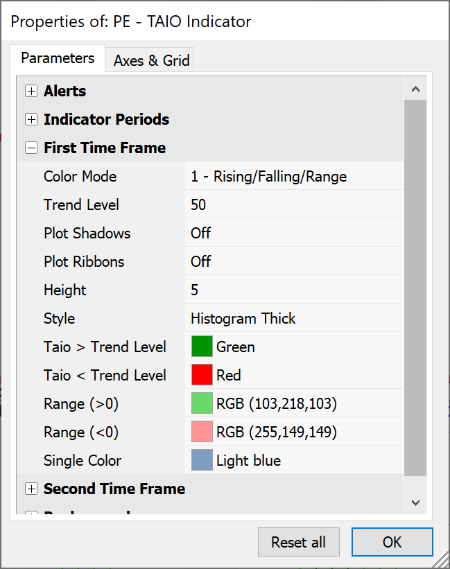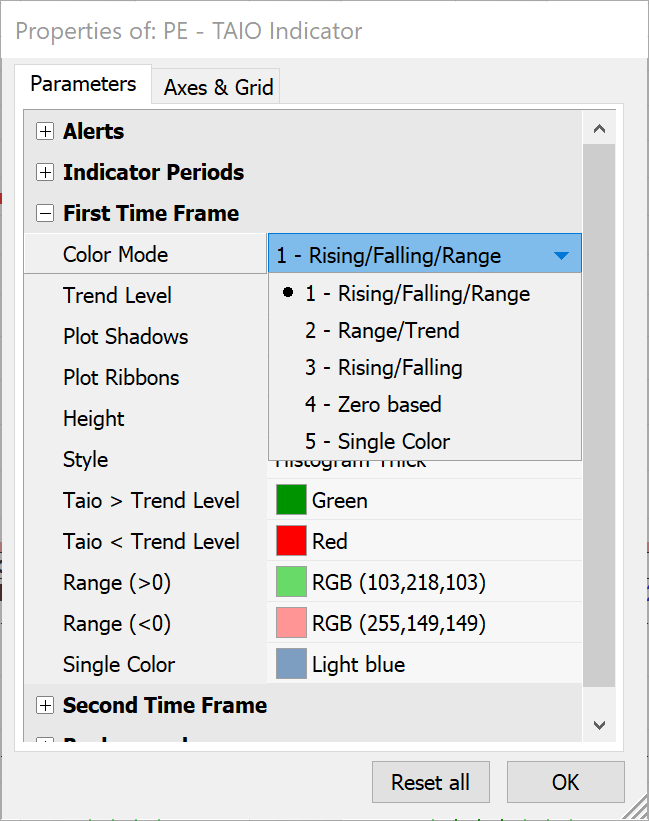 The TAIO indicator is useful for detecting overbought/oversold and trend conditions. Multiple color modes are provided to color the indicator on the behavior of the indicator. This coloring is also available in the price chart and on the ribbon bar. The indicator can also be displayed in a higher time frame to see the trend of two intervals at the same time.